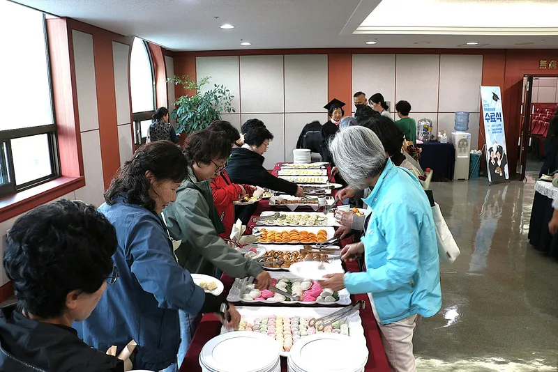 수료식을 마치고 로비에는 주최 측에서 준비한 다과로 그동안 배움을 같이 한 수료생들끼리 이야기를 하면서 좋은 시간을 가졌습니다. 이처럼 배움은 끝이 없는 거 같습니다. 어린아이부터 어르신까지 우리가 평생을 배워도 모자랄 만큼 배움의 중요성은 크다고 할 수 있습니다. 아무쪼록 논산시 행복문화대학을 수료하신 모든 분들에게 축하드립니다.