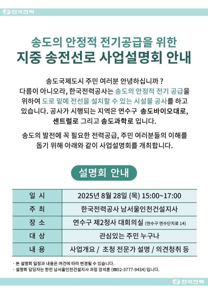 '송도국제도시 지중 송전선로 공사 주민설명회'를