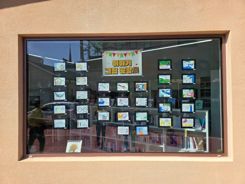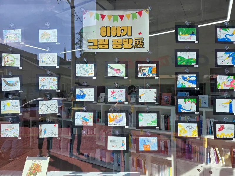 이번 2025년 이야기 그림 공방전의 전시는 난난책방의 액자처럼 큰 창문에 전시가 되었고요.