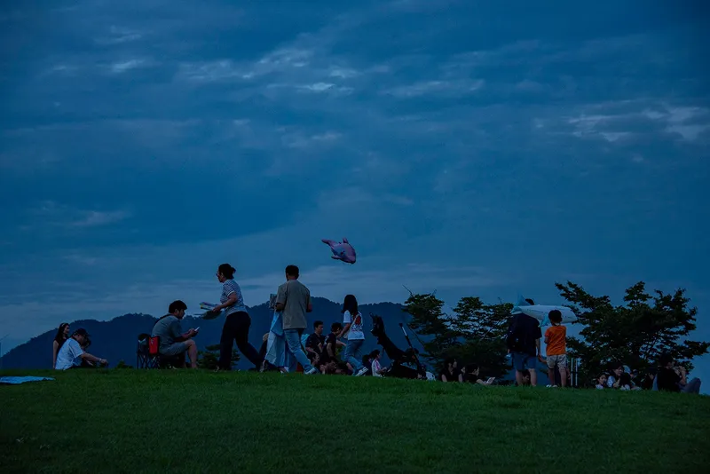 동산에서 풍선 기구를 날리는 아이들의 웃음소리가 여름밤 공원에 울려 퍼집니다.