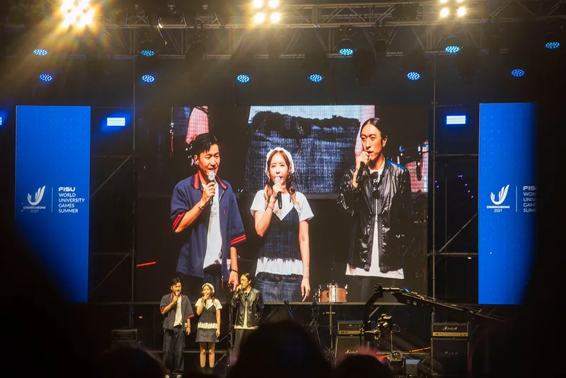 저녁 7시 충청 유니버시아드대회 대회기 전달식에 이어 인기 3인조 혼성 그룹 코요테와 펑크 록 밴드 크라잉넛의 흥이나유 페스티벌 축하 공연이 열광적인 분위기 속에서 진행되면서 세종호수공원의 여름밤은 열기로 가득했습니다.