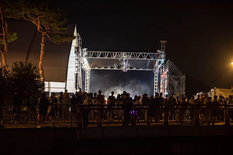 특설무대 주변에 사람들이 가득합니다. 음악과 조명이 어우러져 활기찬 분위기가 연출됩니다.
