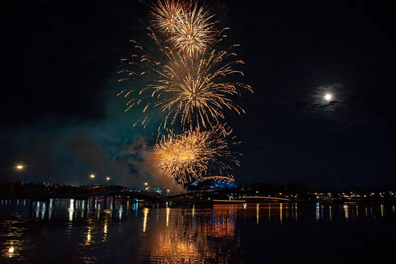 하늘 가득 퍼진 불꽃이 서서히 사라집니다. 달빛만이 여운처럼 남아 호수를 비춥니다.