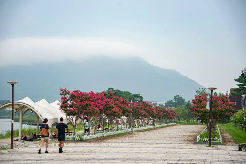곳곳에 붉게 핀 배롱나무꽃도 눈길을 끕니다. 전월산을 배경으로 산책로 양쪽에 곱게 피어 한 폭의 그림 같은 장면을 연출합니다.