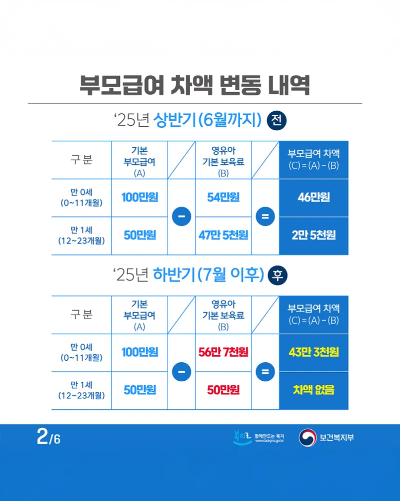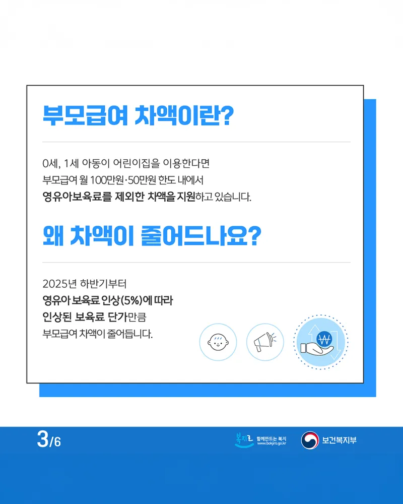 2025년 하반기부터 영유아 보육료 인상(5%)에 따라 인상된 보육료 단가만큼 부모급여 차액이 줄어듭니다.