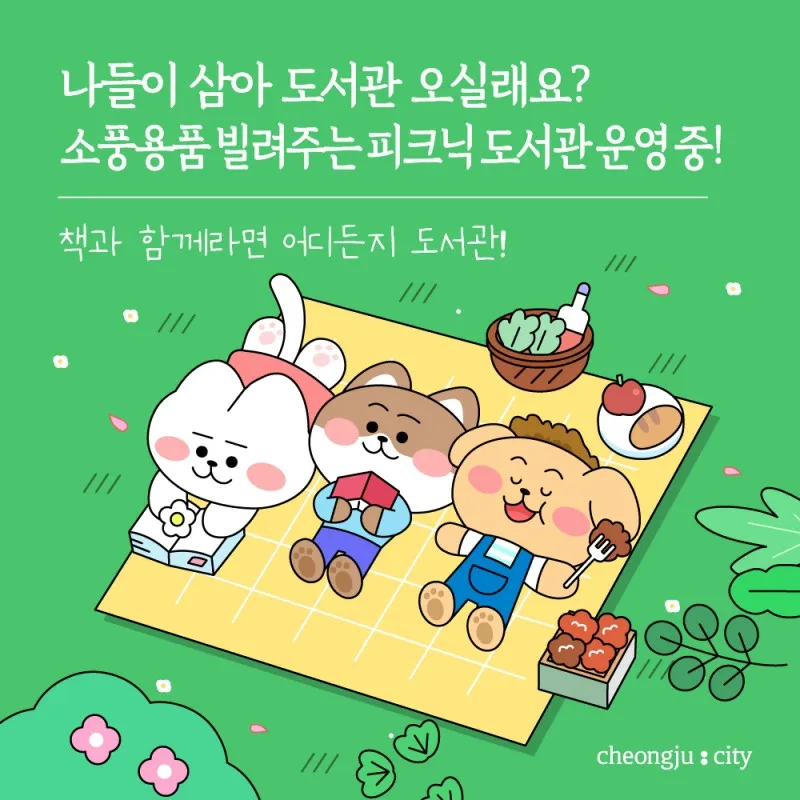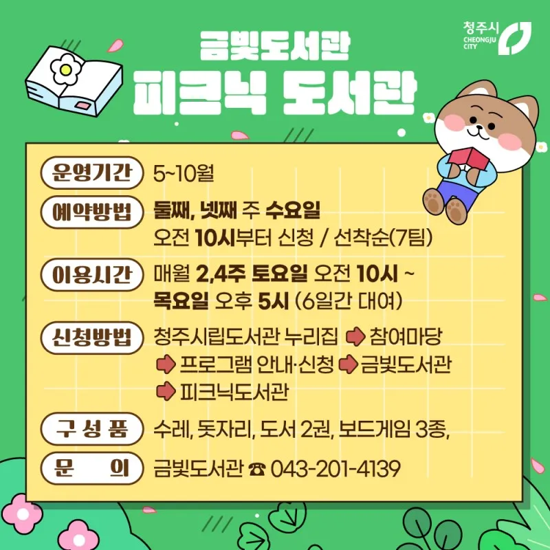 신청방법 : 청주시립도서관 누리집⇒참여마당⇒프로그램 안내·신청⇒금빛도서관⇒피크닉도서관