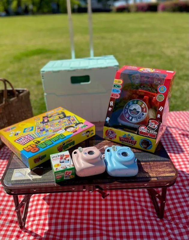 구성품 : 바구니 또는 수레, 돗자리, 도서 1권, 보드게임 1종, 미니 책상, 비눗방울