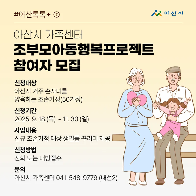 신청대상: 아산시 거주 손자녀를 양육하는 조손가정(50가정)