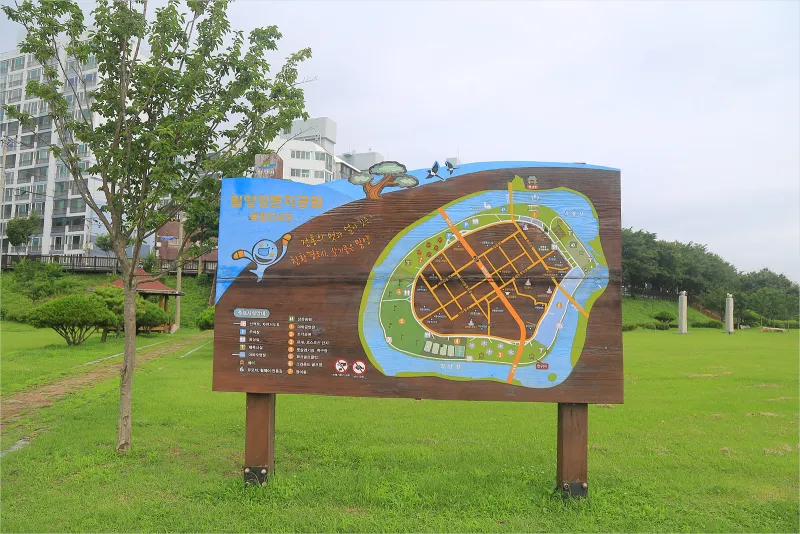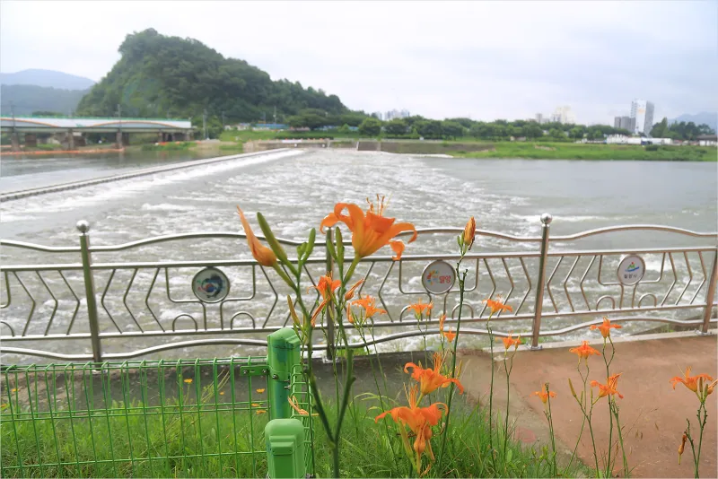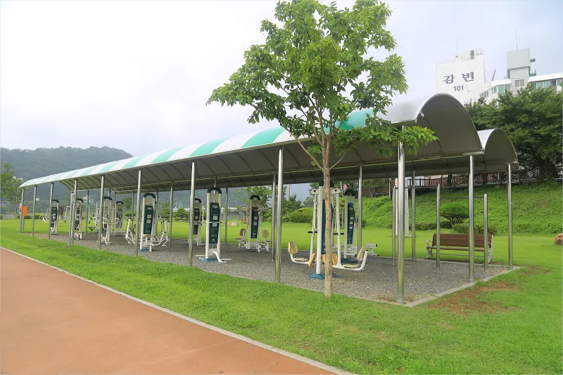 둔치공원에는 산책로, 자전거도로, 체육시설, 쉼터, 유모차, 휠체어 전용길, 삼문 송림, 야외공연장, 암각화 조각 공원, 유채, 코스모스 단지, 풋살경기장, 파크골프클럽, 장미원 등이 조성되어 있습니다.