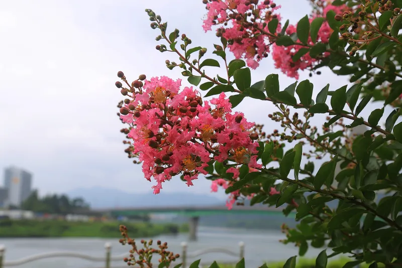 유유히 흐르는 강물을 바라보며 걷다 보니 아침에 꽃을 피웠다가 해가 지면 꽃잎을 접고 밤이면 꽃잎을 떨구는 무궁화와 배롱나무 꽃이 꽃망울을 터뜨려 예쁘게 피어 있습니다.