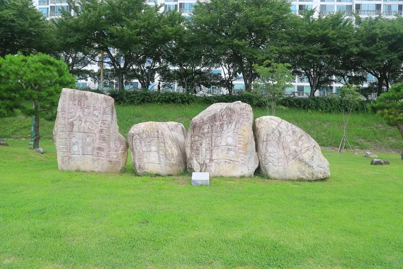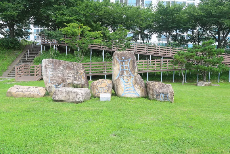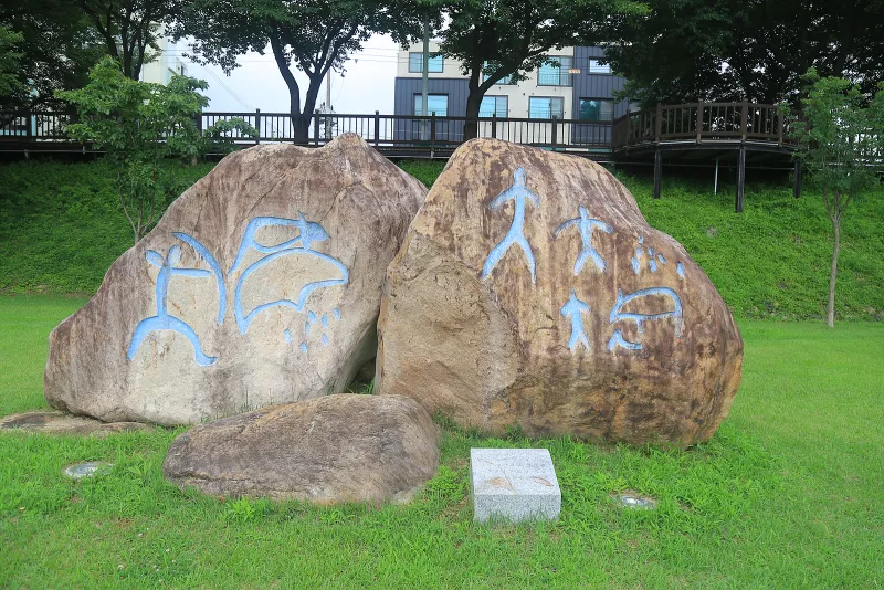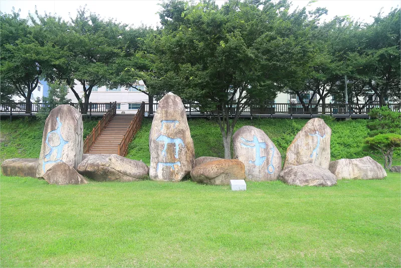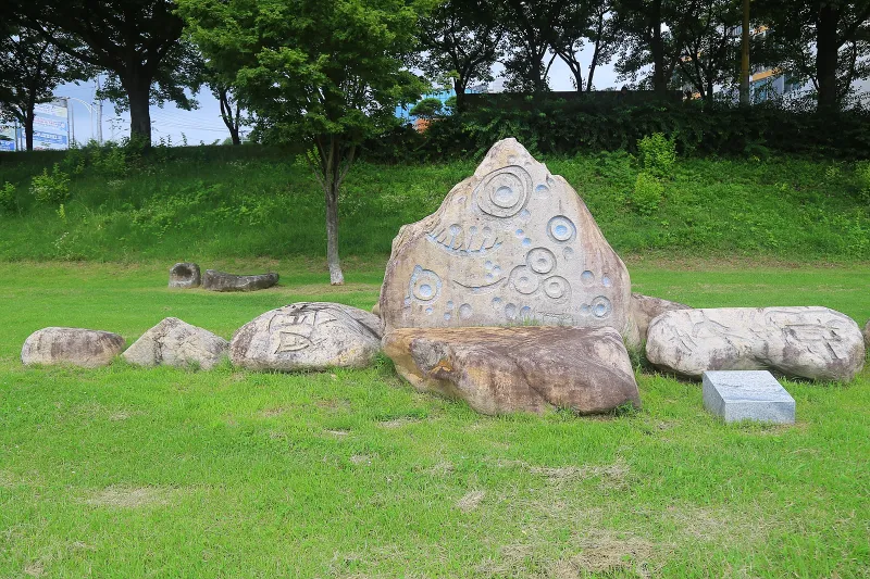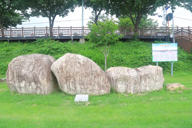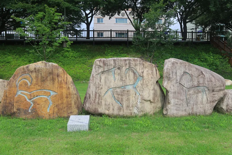 암각화 조각 공원에는 29개의 암각화 조형물이 설치되어 있는데요. 중국, 몽골, 국내에서 발견된 자연석에 새겨진 조각들은 제각각 의미와 자태를 뽐내며 둔치공원 산책길을 걷는 시민들의 눈길을 끌고 있습니다.
