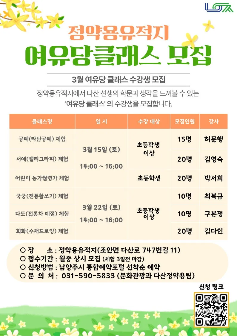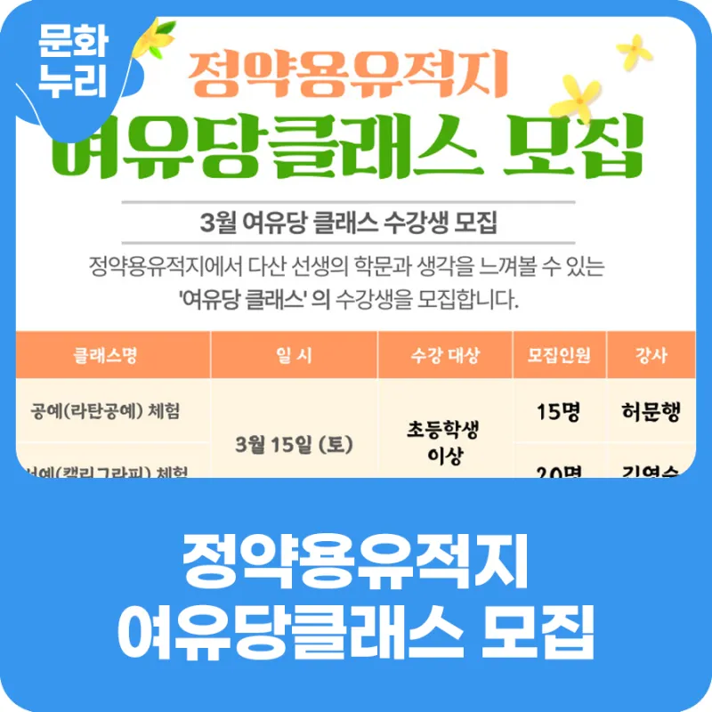 정약용유적지 여유당클래스 3월 수강생 모집 안내