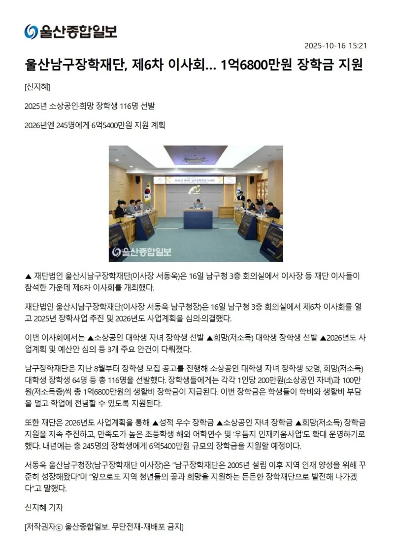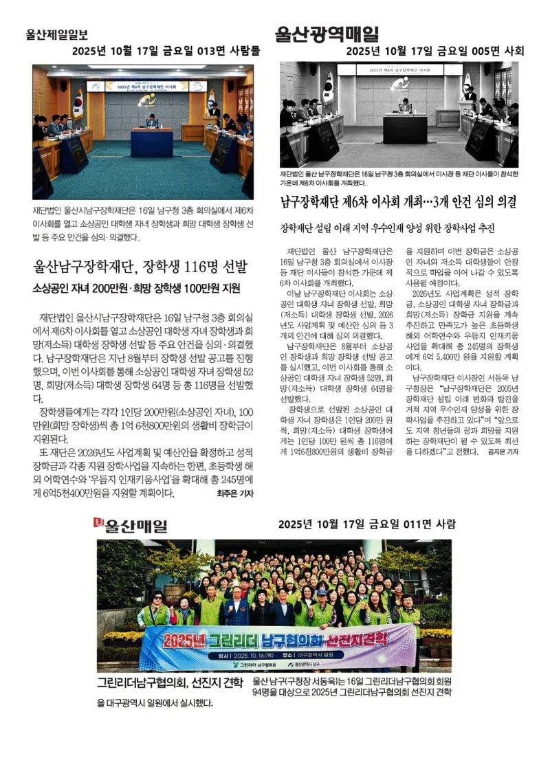 {"title":"[행복남구 오늘의신문] 🏫울산남구장학재단, 장학생 116명 선발🤓 (10월 17일 금요일)","source":"https://blog.naver.com/ulsan-namgu/224044113368","blogName":"울산광역시..","domainIdOrBlogId":"ulsan-namgu","nicknameOrBlogId":"울산광역시남구청","logNo":224044113368,"smartEditorVersion":4,"cafeDisplay":false,"lineDisplay":true,"meDisplay":true,"outsideDisplay":false,"blogDisplay":false}