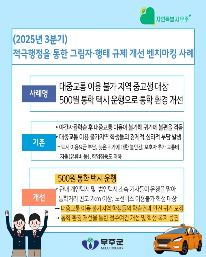 #무주군 #무주 #자연특별시무주 #무주군청 #적극행정 #무주군적극행정 #규제개선 #그림자규제 #행태규제 #규제개선사례 #벤치마킹사례 #행안부선정 #통학택시 #500원통학택시 #학생복지 #교육복지 #안전한귀가 #정주여건개선 #군민체감정책