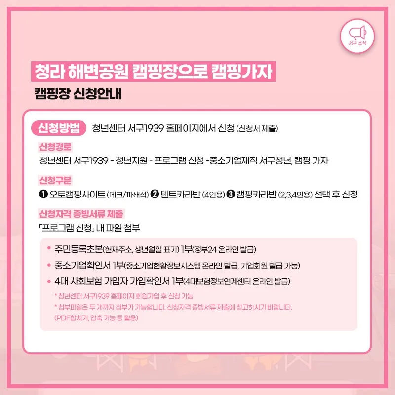 ※ 캠핑장 이용권은 ㈜제이유레저에서 제공하며, 인천 서구청에서 사업 홍보 및 대상자 선정을 진행합니다.