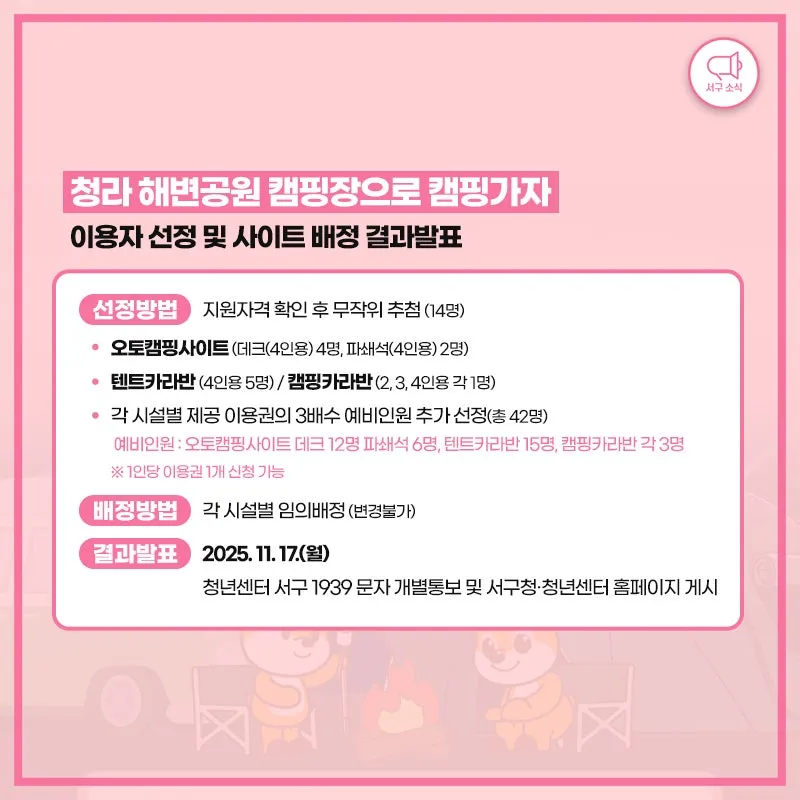 : 캠핑장 이용권은 지원자격을 확인한 후 무작위 추첨(14명)으로 선정됩니다.