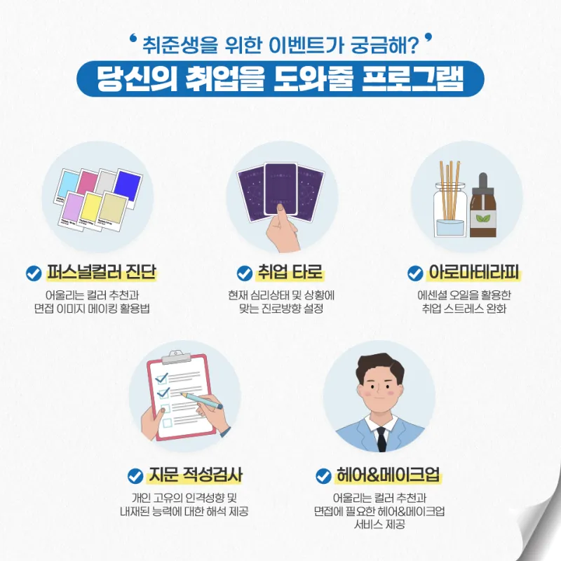 ✅ 타로 직업심리상담, 퍼스널컬러 진단, 헤어&메이크업 등 ✅ 이력서 사진촬영, 사전특강 |