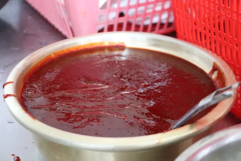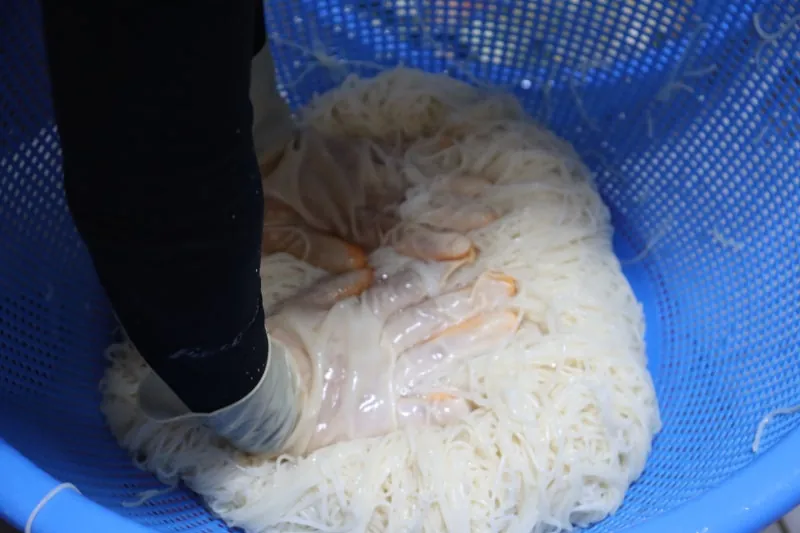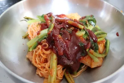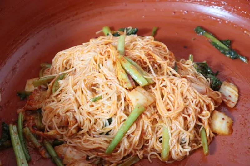 비빔국수 만드는 모습도 보여주셨습니다. 잘 삶아진 국수는 지하수에 씻어내고 충분히 물기를 빼내면 쫄깃하고 맛있는 국수가 됩니다. 거기에 꾸지뽕이 들어간 특제 고추장을 넣고 비빈 후 한 번 더 비빔장을 올려주면 맛있는 꾸지뽕 비빔국수가 완성됩니다.