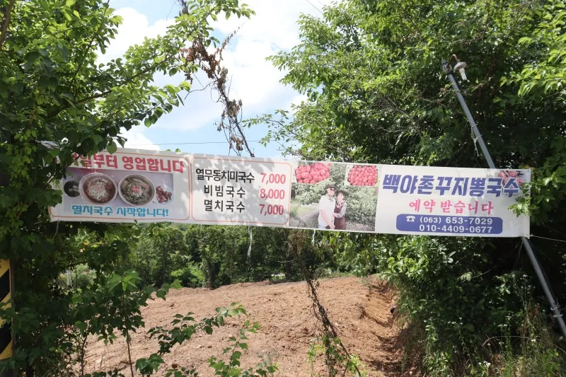 도저히 식당이 나올 것 같지 않은 시골길을 들어가니 반가운 현수막 하나가 보입니다. 바로 ‘백야촌꾸지뽕국수’ 입구입니다, 간판도 이 현수막이 하나라 처음 오시는 분들은 당황하시기도 하는데요, ‘꾸지뽕’이라는 글씨를 보셨다면 잘 찾아오셨습니다.