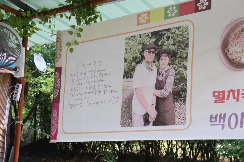 백야촌은 꾸지뽕 농사를 짓는 사장님께서 점심시간만 잠깐 운영하는 식당이라 인테리어 근사한 요즘식 식당은 아닙니다. 하지만, 옛 할머니 댁에 놀러 간 듯 편안함이 함께 하는 곳이지요. 허영만 선생님은 백야촌을 방문하고 나서 “한여름 평상 위에서 온 가족이 식사하던 장면에 대한 가마득한 기억이 있는데, 비빔국수와 열무국수가 그 추억을 불러왔다”라고 이야기하셨습니다. 4년 전 이맘때쯤 방문하셨으니 초여름 저와 비슷한 느낌으로 이곳을 찾은 듯합니다.