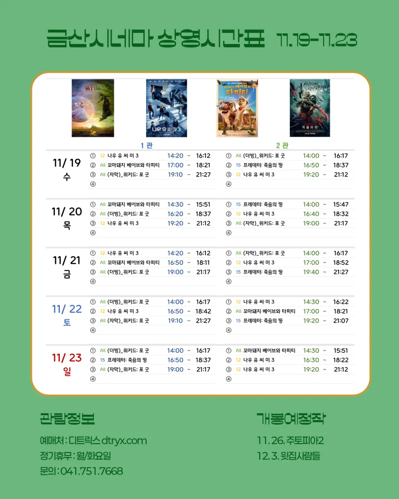 금주의 금산시네마 상영시간표 11.19.(수) - 11.23.(일)
