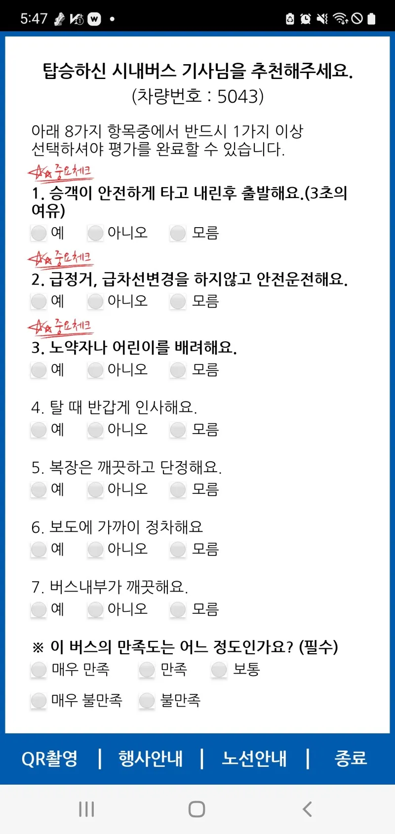 탈 때 반갑게 인사해 주셨는지, 복장은 깨끗한지,