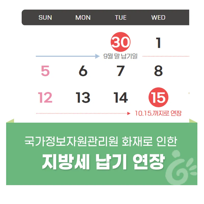 국가정보자원관리원 화재로 인해 아래와 같이 지방세 납기가 연장됨을 알려드립니다.