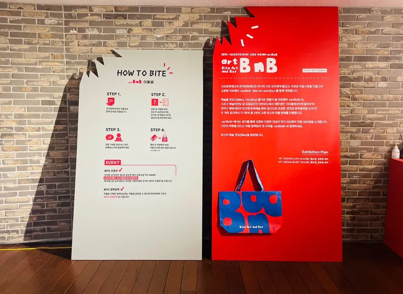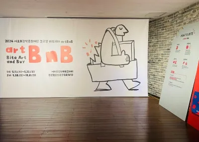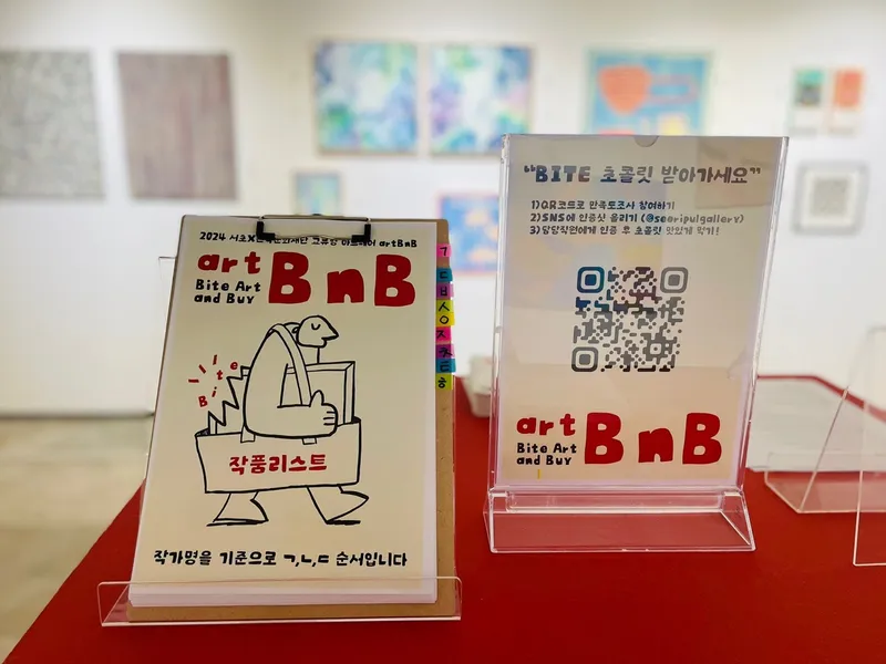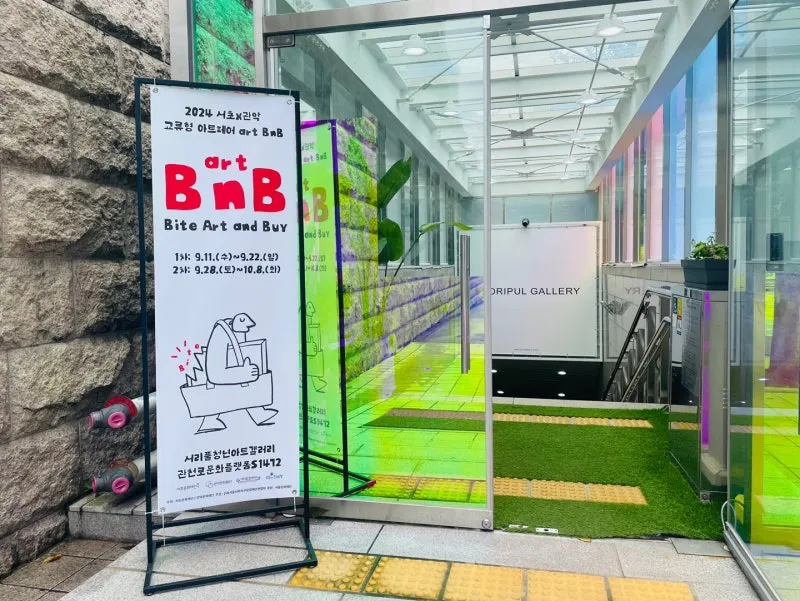 서리풀청년아트갤러리는 매달 다양한 주제로 청년 작가들의 작품이 전시되는 곳인데요. 이번에는 새로운 컨셉의 아트페어가 열린다고 해서 다녀왔습니다. 바로 교류형 아트페어인 <artBnB : Bite Art and Buy>입니다. 서초문화재단과 관악문화재단이 함께 개최하는 아트페어로, 예술을 맛보고(Bite), 사는(Buy) 즐거운 경험을 제공합니다.