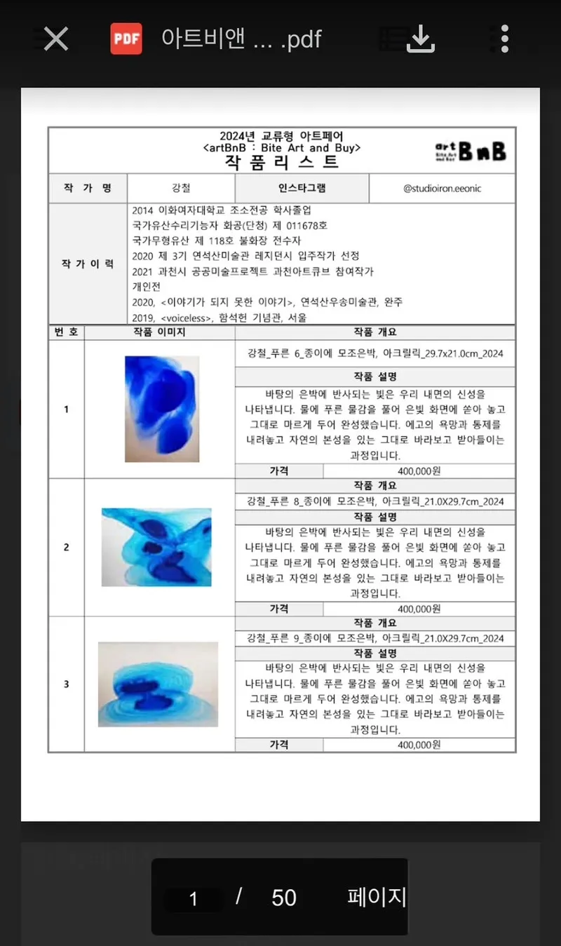 2) QR 코드 : 작품리스트 QR 코드를 찍어보시면, 아래와 같이 PDF 파일이 열립니다. 휴대폰으로 확인하실 수도 있어요.