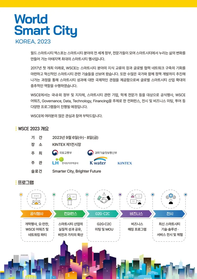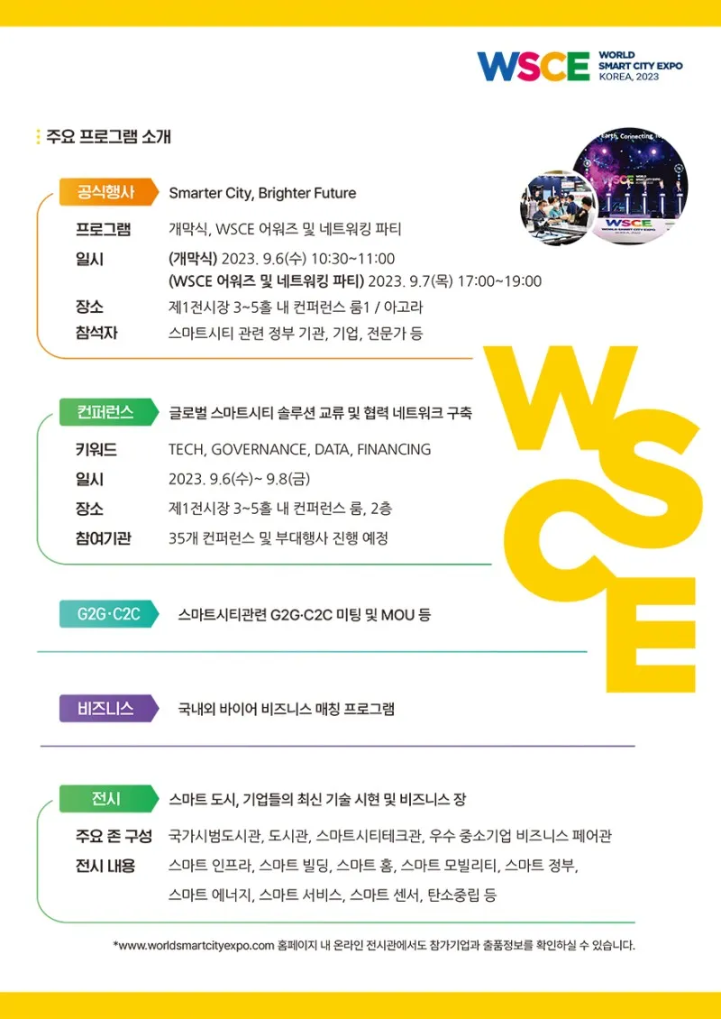 WSCE에서는 국내외 정부 및 지자체, 스마트시티 관련 기업, 학계 전문가 등을 대상으로 공식행사, WSCE 어워즈, Governance, Data, Technology, Financing을