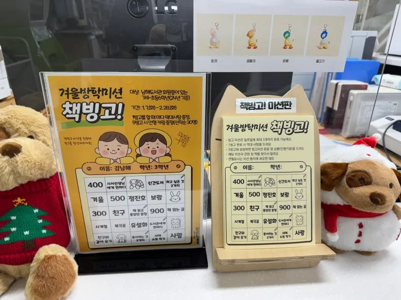 겨울방학미션 책빙고 이벤트도 진행되고 있네요. 1빙고 할 때마다 막대사탕, 5빙고 시 인형 키링을 증정 한다고 해요.