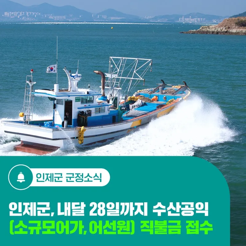 인제군, 내달 28일까지 수산공익 [소규모어가, 어선원] 직불금 접수
