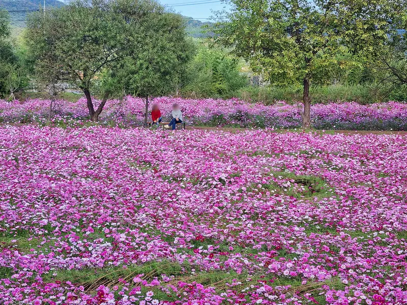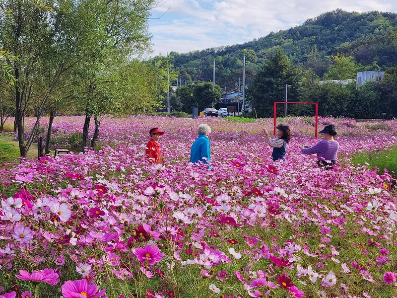 하얀색부터 자주색까지, 그 사이의 모든 색깔이 다 들어있는 듯한 코스모스 꽃밭에서 어르신들이 사진을 찍고 있습니다. 백발이 성성한 할머니지만 하늘거리는 코스모스에 마음은 소녀처럼 과거를 걷습니다. 이곳은 논산 핫플레이스, 돈암서원 코스모스 꽃밭입니다.