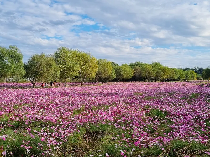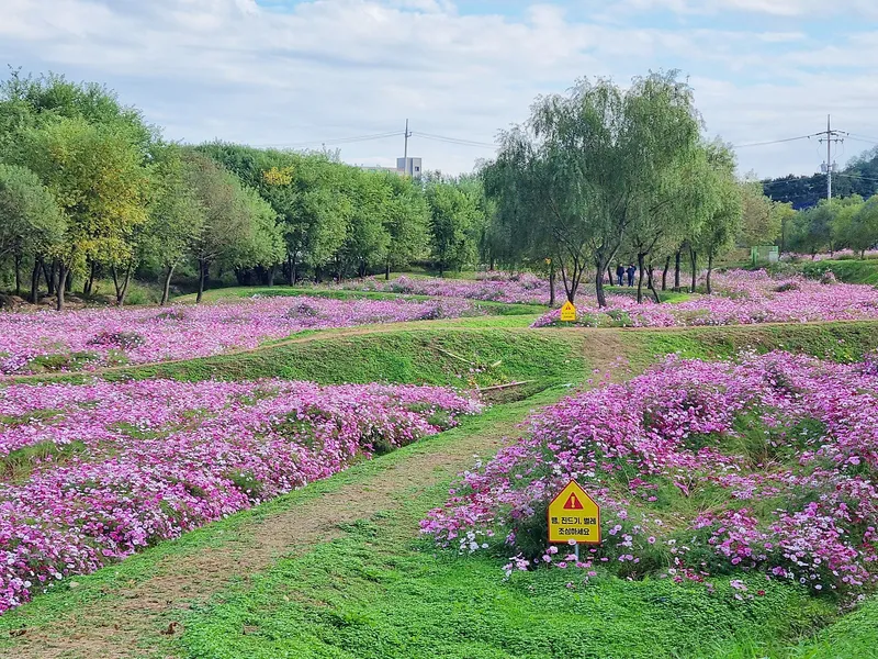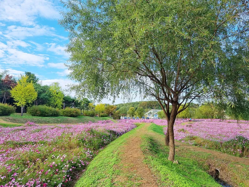 한눈에 보아도 끝이 없이 넓게 펼쳐진 꽃밭에 보는 순간 '와' 탄성이 나옵니다. 가운데로는 버드나무가 둥실둥실 서 있어서 햇살이 눈이 부신 날은 그늘에서 잠시 쉬어도 좋습니다. 원래 돈암서원 아래에는 다랭이논이 있었는데요. 예전엔 일부를 이용해서 꽃을 심곤 하더니 올해에는 이 넓은 곳을 모두 코스모스 꽃밭으로 조성했습니다.