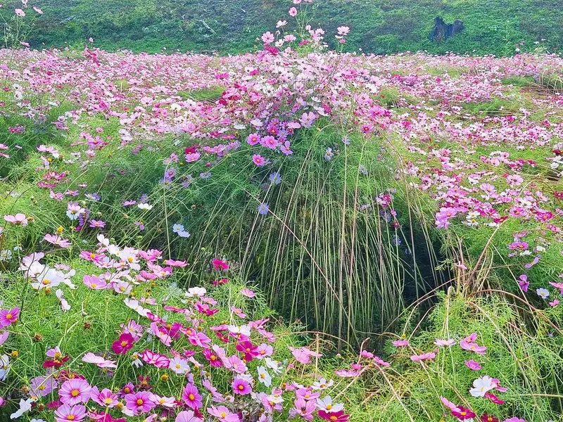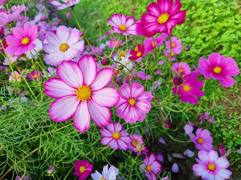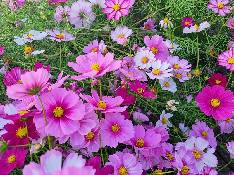 흰색부터 자주색까지, 그 가운데 있는 모든 색상이 이곳에 있습니다. 심지어 테두리만 더 진한 코스모스 꽃도 있습니다. 엉성한 줄기 위로 꽃은 촘촘히 자리를 잡았습니다.