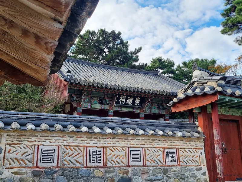 돈암서원의 뒤쪽으로 300년 보호수 향나무를 지나면 돈암서원의 사당인 숭례사가 보입니다. 숭례사는 선현의 제사를 모시는 곳입니다. 이곳은 숭례사 꽃담이 유명한데요. 담에 그려진 그림은 전서체 글자를 새겨 놓은 꽃담입니다. 문 왼쪽의 네 글자는 '서일 화풍'으로 '좋은 날씨 따뜻한 바람처럼 사람을 대하라'라는 뜻입니다.