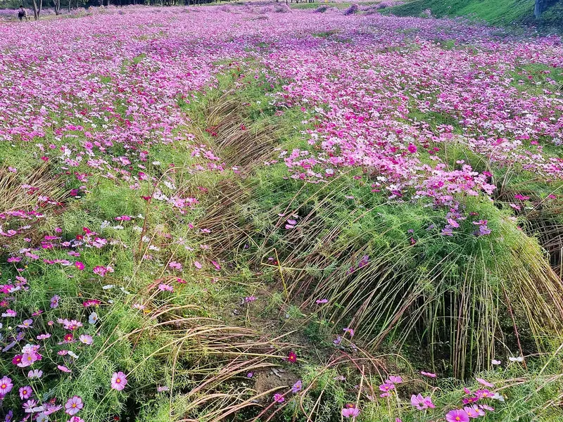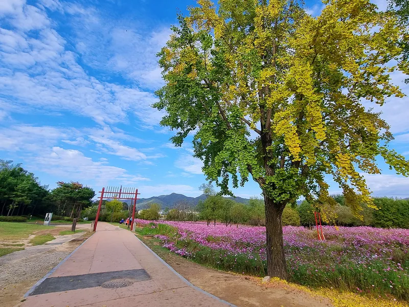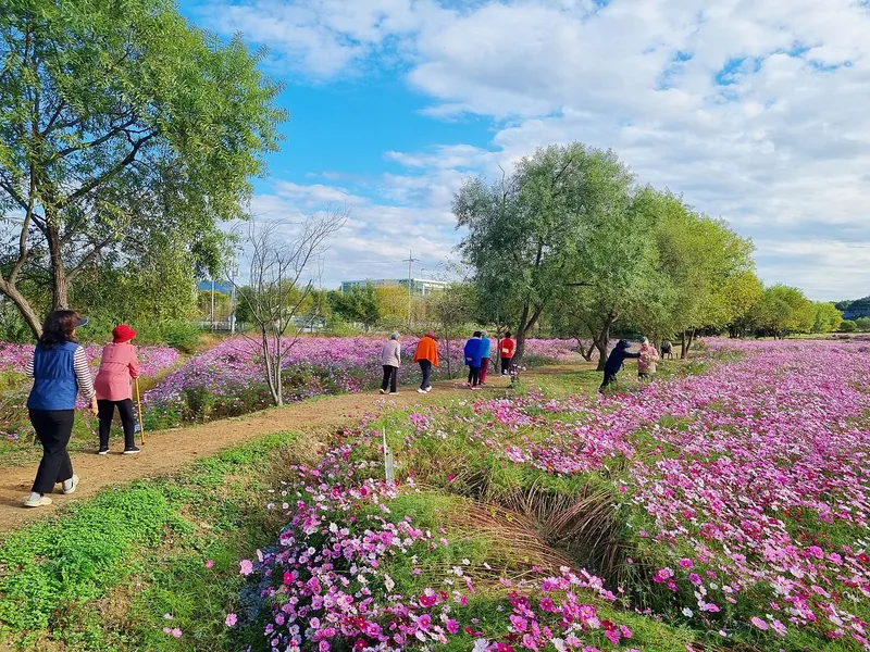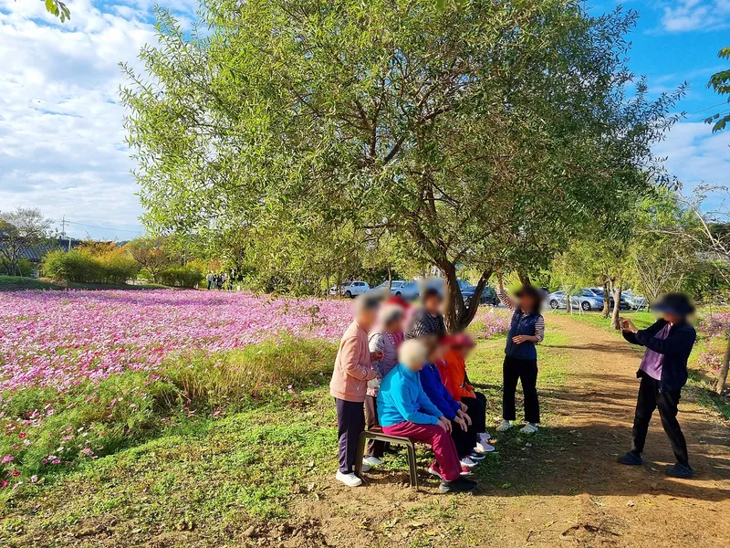 소문이 나면서 인근 지역뿐만 아니라 먼 데서도 논산을 여행할 때 들르는 곳이 되었다는데요. 늦가을을 재촉하는 단풍이며, 들판의 코스모스 때문에 벌써 한 해가 다 간 듯합니다. 주간보호 센터에서 나오신 어르신들이 꽃밭에서 단체사진을 찍고 계십니다. 평소에 나들이가 쉽지 않을 텐데요. 이곳 코스모스 꽃밭은 평지라 편안하게 걸으며 꽃을 감상하기 좋습니다.