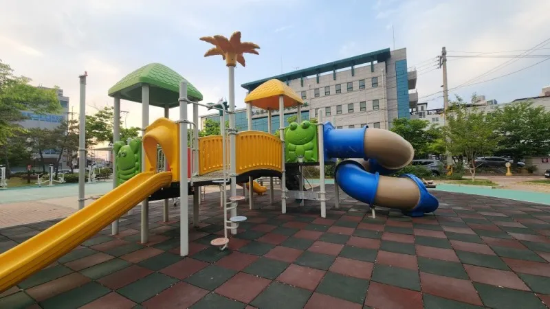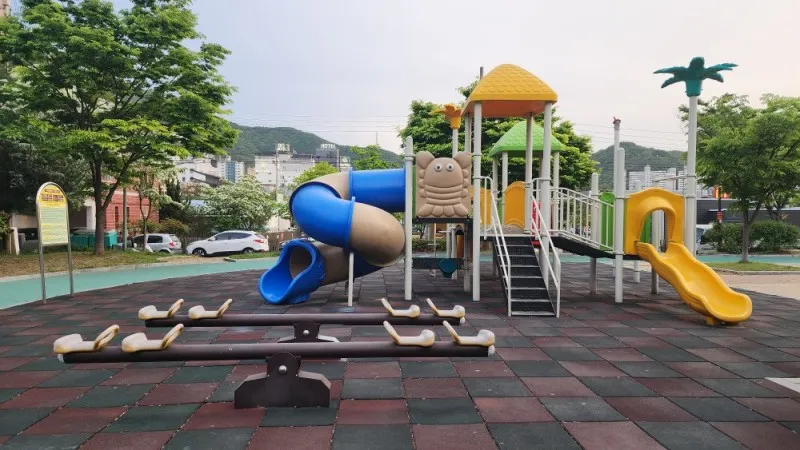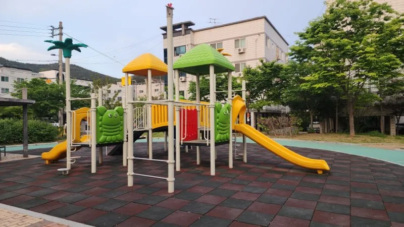 놀이터 바닥은 우레탄으로 되어 있어 아이들이 뛰다가 넘어져도 다치지 않을 것 같아요.