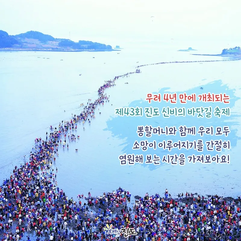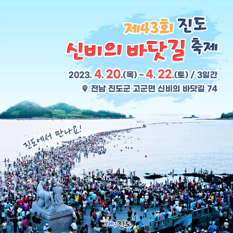 축제소식 축제소식 축제유래 축제연혁 축제장 안내도 축제소식 진도 바닷길 열림 정보 바닷길: 진도~모도 (Jindo~Modo), 현대판 모세의 기적 열림시각(해할예보값): 첫째날17:40(-4), 둘째날18:10(-7) 셋째날 18:50(0) 국립해양조사원에 따르면 해할예보값 (–30)에서 바닷길이 완연히 열리며 당일 기상상황에 따라 바닷길 열림 정도가 다소 달라질 수 있음. 지구 기후 온난화 영향으로 해수면이 상승되어 진도바닷길도 영향 받고 있음. 2023년 진도 신비의 바닷길 열리는 시간 진도 신비의 바닷길 열리는 일정 다음 표는...