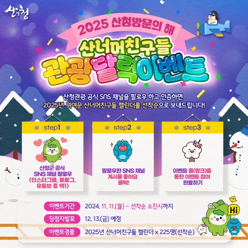 🎈2025 산청방문의해 이벤트🎈 산청관광 공식 SNS채널을 팔로우 하고 인증하면 2025년 산너머친구들 캘린더를 선착순으로 보내드려요💚 📆이벤트 기간 : 2024. 11. 11.(월) ~ 선착순 소진시까지📢당첨자 발표 : 2024. 12. 13.(금) 예정🎁이벤트 경품 : 2025년 산너머친구들 캘린더 * 225명(선착순)✅참여방법1) 산청관광 공식 SNS채널 팔로우(인스타그램, 블로그, 유튜브 중 택1)2) 팔로우한 SNS채널 게시물 좋아요 클릭!3) 제공된 폼 통한 이벤트 참여 📢 팔로우(구독 등) 인증이 부정확할...
