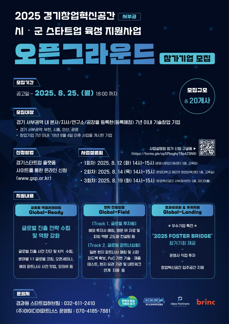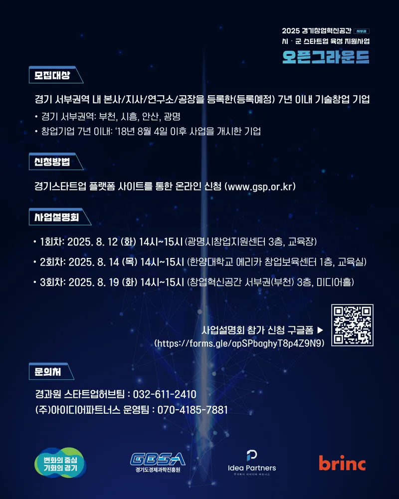 '2025 경기 창업혁신공간(서부권) 시・군 스타트업 육성 지원사업(오픈그라운드)' 사업에 대한 참여기업의 이해도 제고를 위해 지원 내용, 신청 절차, 평가 방식 등을 안내하는 현장 설명회를 진행합니다. <사업설명회 일정> - 1차: 25년 8월 12일 (화) 14시~15시 / 광명시창업지원센터 3층, 교육장 - 2차: 25년 8월 14일 (목) 14시~15시 / 한양대 에리카 창업보육센터 1층, 교육실 - 3차: 25년 8월 19일 (화) 14시~15시 / 창업혁신공간 서부권(부천) 3층, 미디어홀