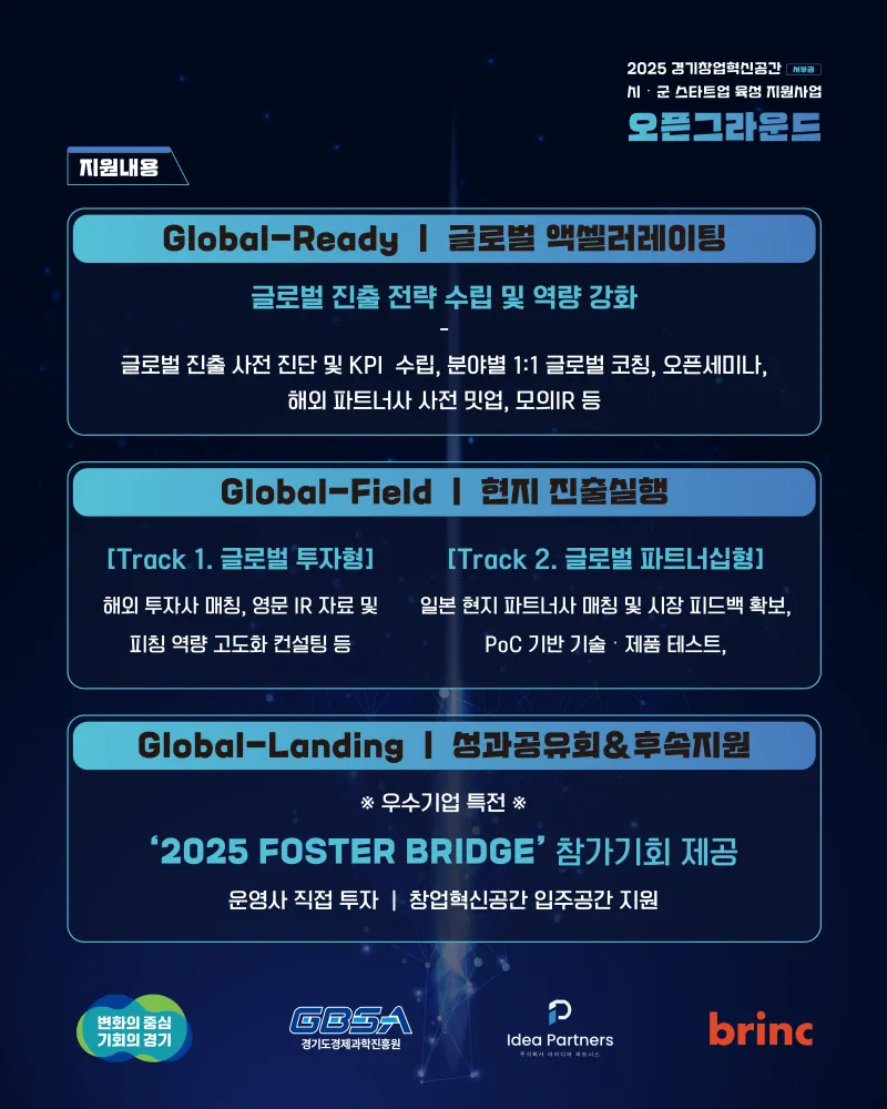 [Track 1. 글로벌 투자형] 해외 투자사 매칭, 영문 IR자료 및 피칭 역량 고도화 컨설팅 등 [Track 2. 글로벌 파트너십형] 일본 현지 파트너사 매칭 및 시장 피드백 확보, PoC 기반 기술·제품 테스트, 현지 유관 기관 및 네트워크 연계 지원 등 |