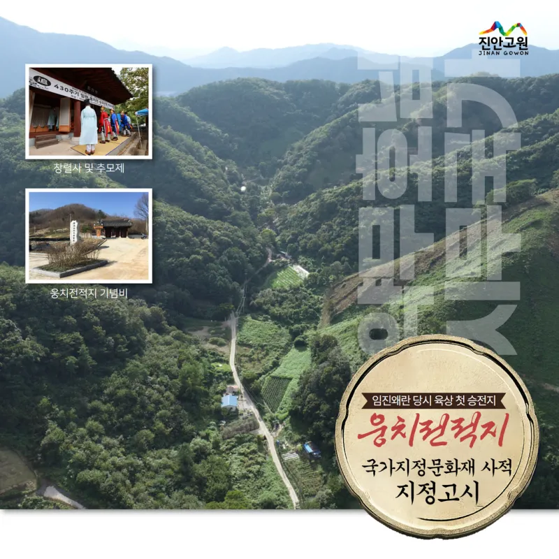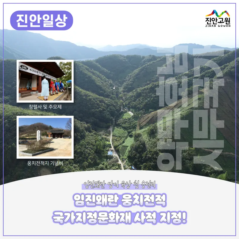 10월 12일 문화재청에서 개최된 문화재위원회(사적분과)에서 진안군민의 염원을 담은 '임진왜란 웅치전적' 국가 사적 지정이 가결되었고, 11월 11일부터 30일간 지정예고를 통해 토지소유주 및 이해관계자, 주민들의 의견을 수렴한 바 있는데요.