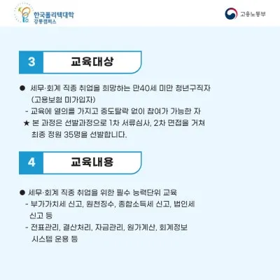 커뮤니티 왼쪽메뉴 공지사항 서식자료실 사진자료실 언론보도 Q&A 공지사항 홈 커뮤니티 공지사항 sns공유하기 프린트 작성일 2024.08.09 , 조회수 252 공지사항 상세보기 - 제목, 내용, 파일 정보 제공 제목 청년구직자 세무, 회계 직종 국비 무료 교육생 모집(구직자 취업연계형 일학습병행) 내용 강릉 폴리텍 산학협력처에서 취업 연계형 국비 무료 교육생을 모집합니다. - 대 상 : 만 40세 미만 구직자 (고용보험 미가입자) - 교육기간 : 2024년 9월 26일~ 10월 25일 (20일) - 교육내용 : 세무·회계 분...