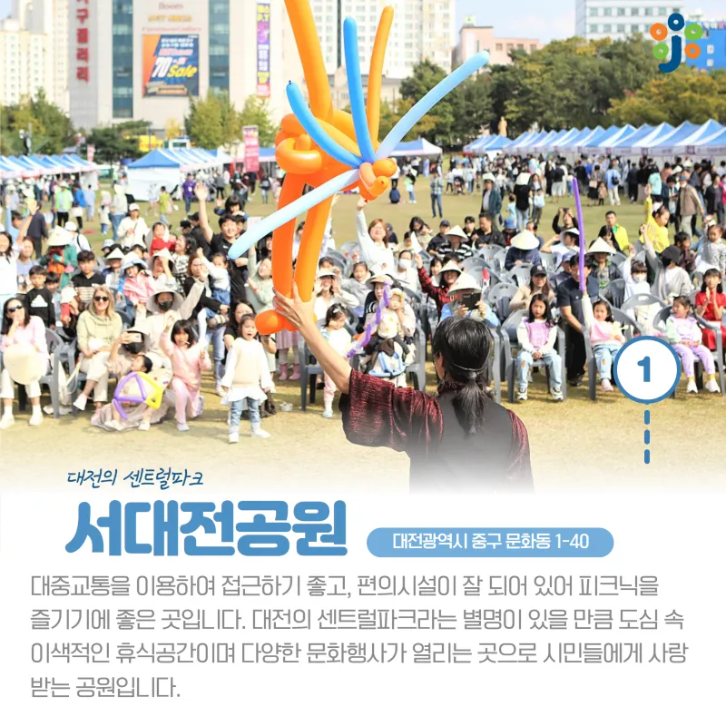 서대전 네거리 역 바로 위에 위치한 서대전공원은 빌딩 숲 사이 푸른 잔디밭을 가진 시민들의 휴식공간입니다.