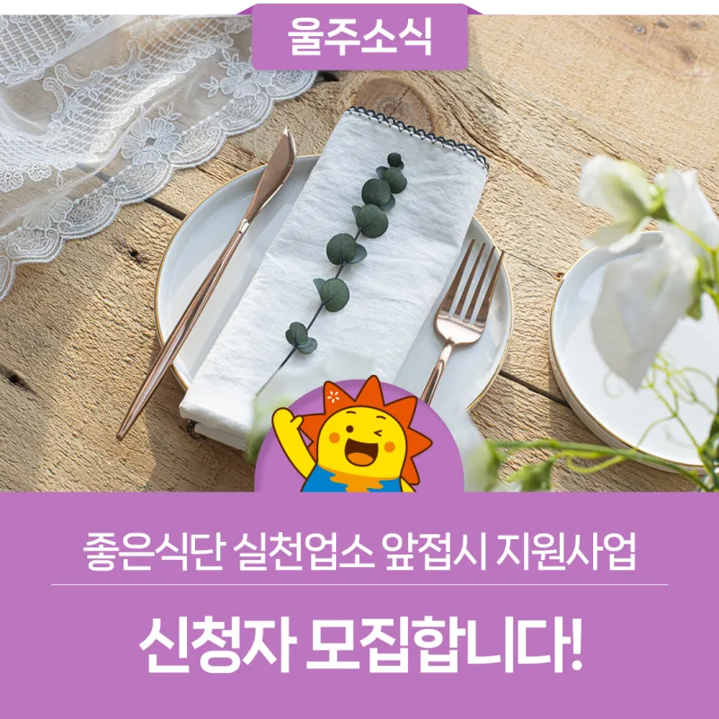 울주군이 이 같은 식문화 개선 인식을 확산하고, 좋은식단 자율실천으로 위생적인 외식환경을 조성하기 위해 「좋은식단 실천업소 앞접시 지원사업」 에 참여할 신청자를 모집합니다!