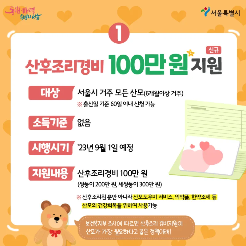 9월부터 모든 출산가정에 산후조리경비 100만 원을 지원합니다!
