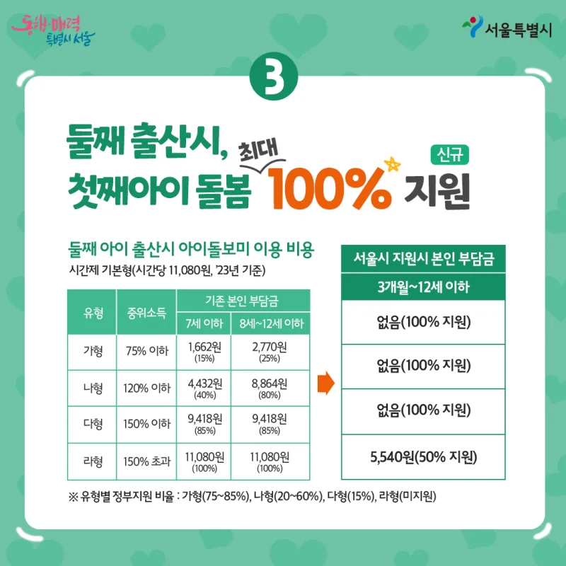 첫째아이 돌봄 최대 100% 지원 (신규)