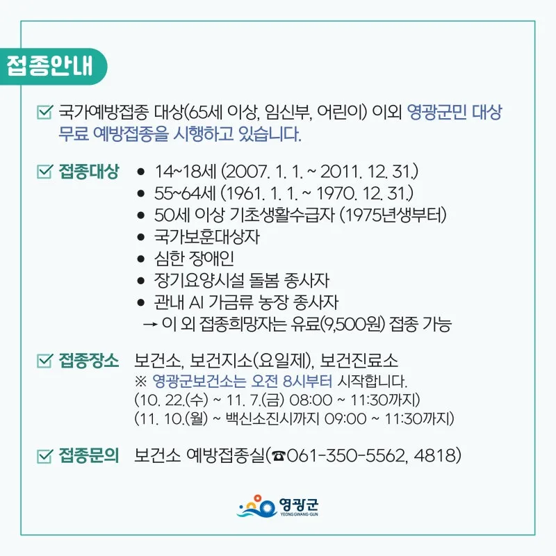 올해는 영광군민을 위한 무료 접종 대상이 확대되었습니다!