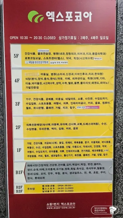 엑스포코아의 영업시간은 매일 10:30부터 20:30까지이며, 매달 2, 4번째 일요일은 정기 휴무입니다.